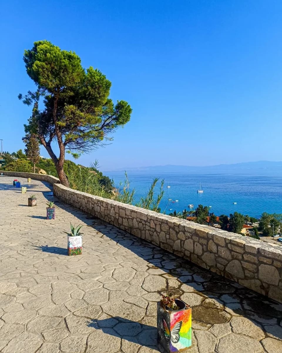 Esplorate la piazza centrale, visitate la storica chiesa di Agios Dimitrios e percorrete il sentiero sulla scogliera fino al mare, dove molti hotel pubblicizzano una terrazza con vista panoramica. La piccola pasticceria Mandanis è un segreto locale per il miglior tsoureki (pane dolce) fatto in casa. Gli autobus fermano nel centro del villaggio; le prime ore del mattino sono magiche quando la luce illumina le vecchie pietre, e soggiornare qui rende facile raggiungere Nea Potidea o Sithonia per gite di un giorno.
