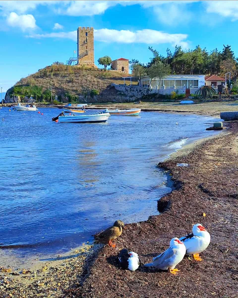 Nea Fokea combina una lunga spiaggia sabbiosa con il fascino storico, incentrato su una torre bizantina e una cappella sul mare vicino all’ingresso nord di Kassandra. Il profumo del sale e dei pini si mescola nell’aria del mattino mentre i pescherecci tornano con il loro primo pescato. Ho esplorato le rovine della torre all’alba, poi mi sono unito alla gente del posto per un caffè in un bar sul porto, un modo gentile per soggiornare in Calcidica prima di esplorare i punti panoramici del Monte Athos all’orizzonte.