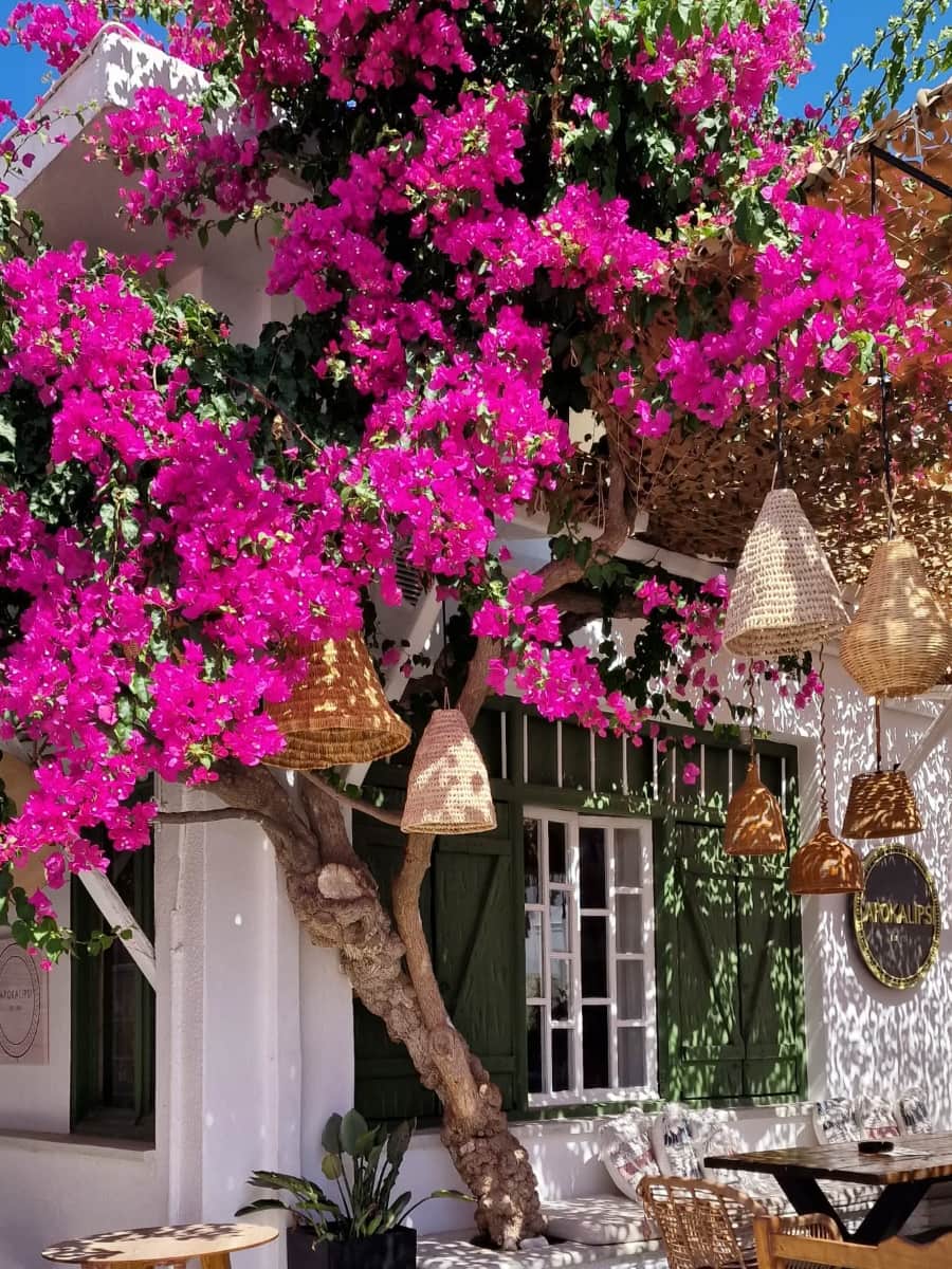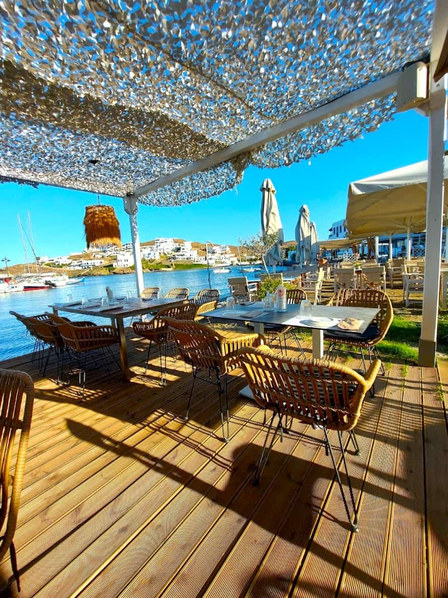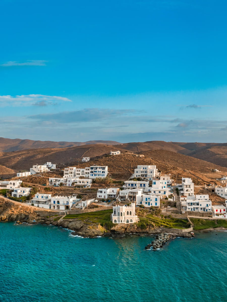 Il villaggio è collegato a Chora da un percorso panoramico di 15 minuti in auto attraverso dolci colline punteggiate di oleandri e timo selvatico. Le passeggiate serali sul lungomare sono perfettamente sicure, con le luci delle taverne che si riflettono sulle calme acque della baia.