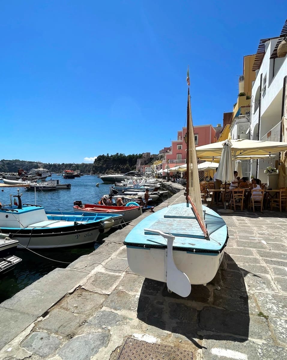 Un giorno è sufficiente per avere un buon assaggio di Procida, ma vorrei sempre avere più tempo a disposizione. In una gita di un giorno posso vedere Marina Corricella, salire a Terra Murata e visitare una spiaggia. Tuttavia, pernottando posso vivere l’isola senza la folla e godermi appieno i famosi tramonti. Se fate una gita di un giorno, vi consiglio di prendere il traghetto più presto e di programmare il ritorno tra le 18:00 e le 19:00 per evitare di correre.