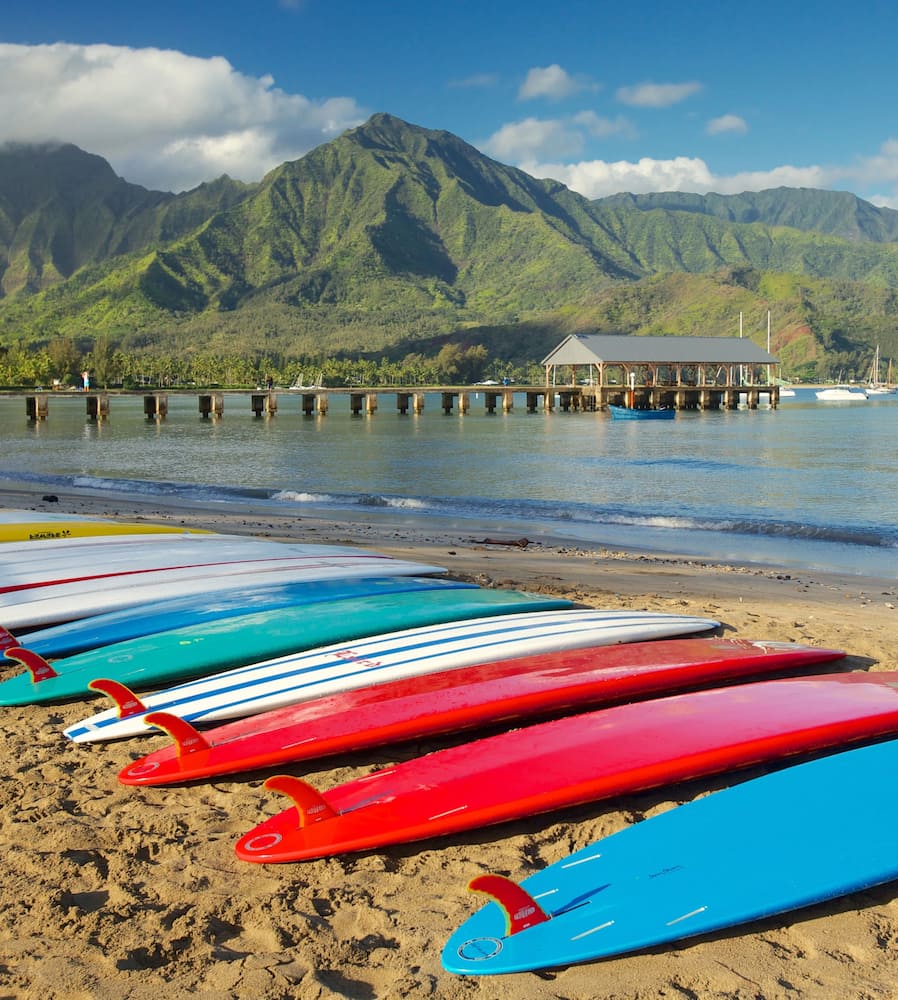 Hanalei Bay, sulla costa settentrionale di Kauai, è una spiaggia a forma di mezzaluna che si estende per quasi tre chilometri. La sua sabbia bianca incontaminata è sostenuta da maestose montagne verdi e scogliere, creando un paesaggio mozzafiato. La spiaggia offre condizioni eccellenti per nuotare, fare surf, bodyboard e kayak.