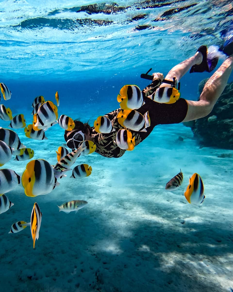 Avventure acquatiche e vita marina. La laguna qui è irreale: l’acqua ha tutte le sfumature di blu che si possano immaginare. Ho fatto un tour della laguna di un’intera giornata con la Bora Bora Pearl Company che includeva lo snorkeling al Coral Garden, il nuoto con le razze al lagunarium e il pranzo su un motu privato. Le immersioni con TopDive ti portano a vedere enormi pesci Napoleone e squali di barriera.